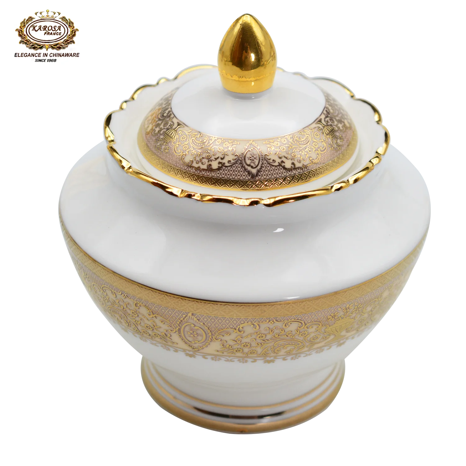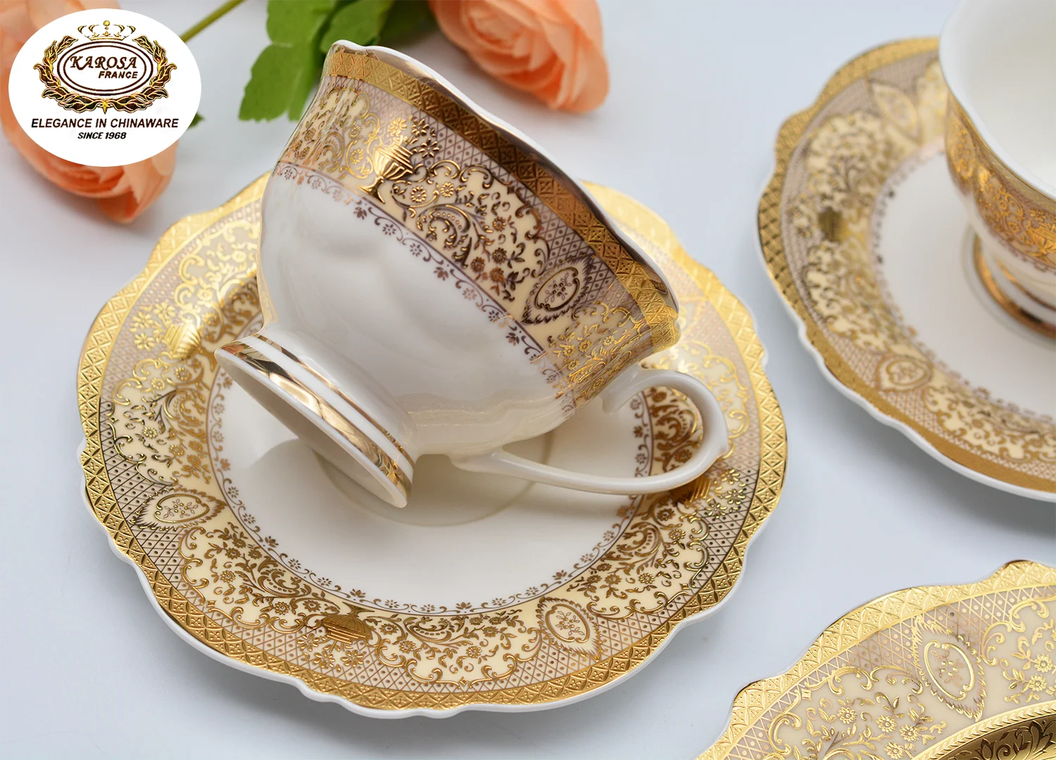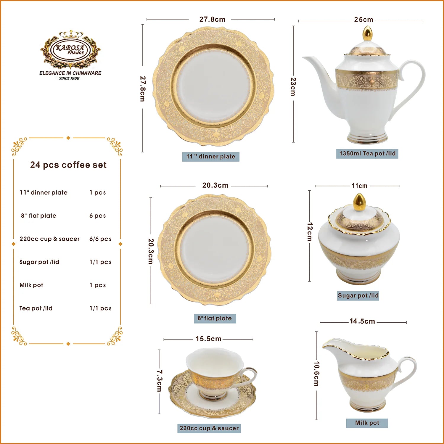 ٣) تُجسّد التصاميم المميزة لأطقم العشاء والشاي، المصنوعة من البورسلين الأبيض الفاخر والخزف الصيني الفاخر، الطابع الملكي الأصيل. تتناغم الزخارف البارزة مع الزخارف الذهبية اللامعة.