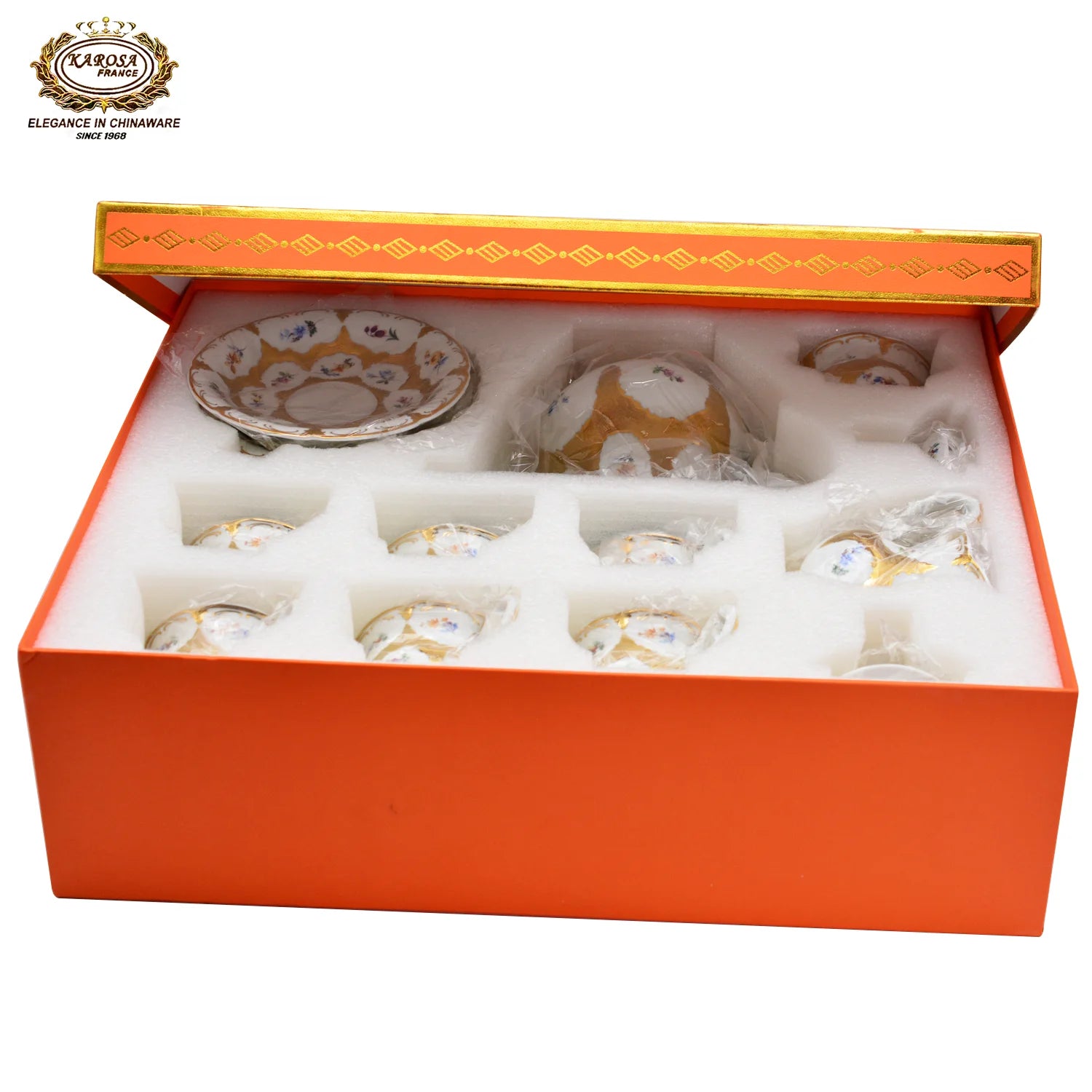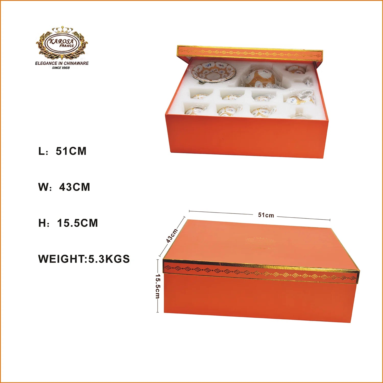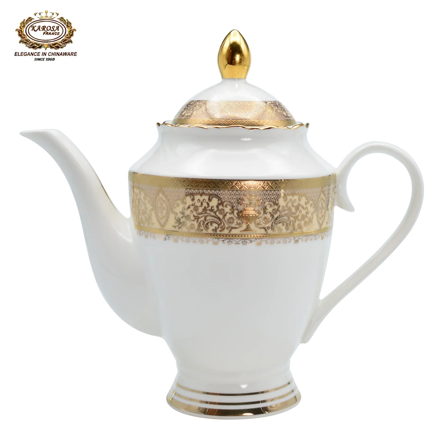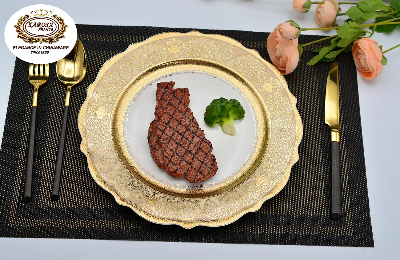 ٣) تُجسّد التصاميم المميزة لأطقم العشاء والشاي، المصنوعة من البورسلين الأبيض الفاخر والخزف الصيني الفاخر، الطابع الملكي الأصيل. تتناغم الزخارف البارزة مع الزخارف الذهبية اللامعة.