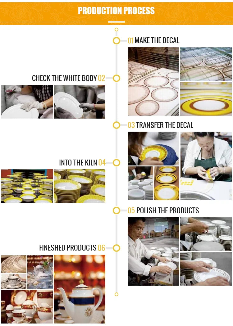 في عملية التصنيع، نستخدم أحدث تصميمات الملصقات، التي تُبرز الأشكال المحيطة بأطقم أدوات المائدة، مما يجذب الانتباه. وفي الوقت نفسه، بفضل تقنية الذهب المتطورة، يُمكن تثبيت الذهب الخالص بشكل طبيعي على أطقم أدوات المائدة. والأهم من ذلك، يُجري قسم الجودة لدينا عمليات تفتيش دقيقة على الهيكل الأبيض، والمنتجات شبه المصنعة، والمنتجات النهائية، للتأكد من أن منتجاتنا آمنة على جسم الإنسان، مما يضمن عشاءً آمنًا ومريحًا.