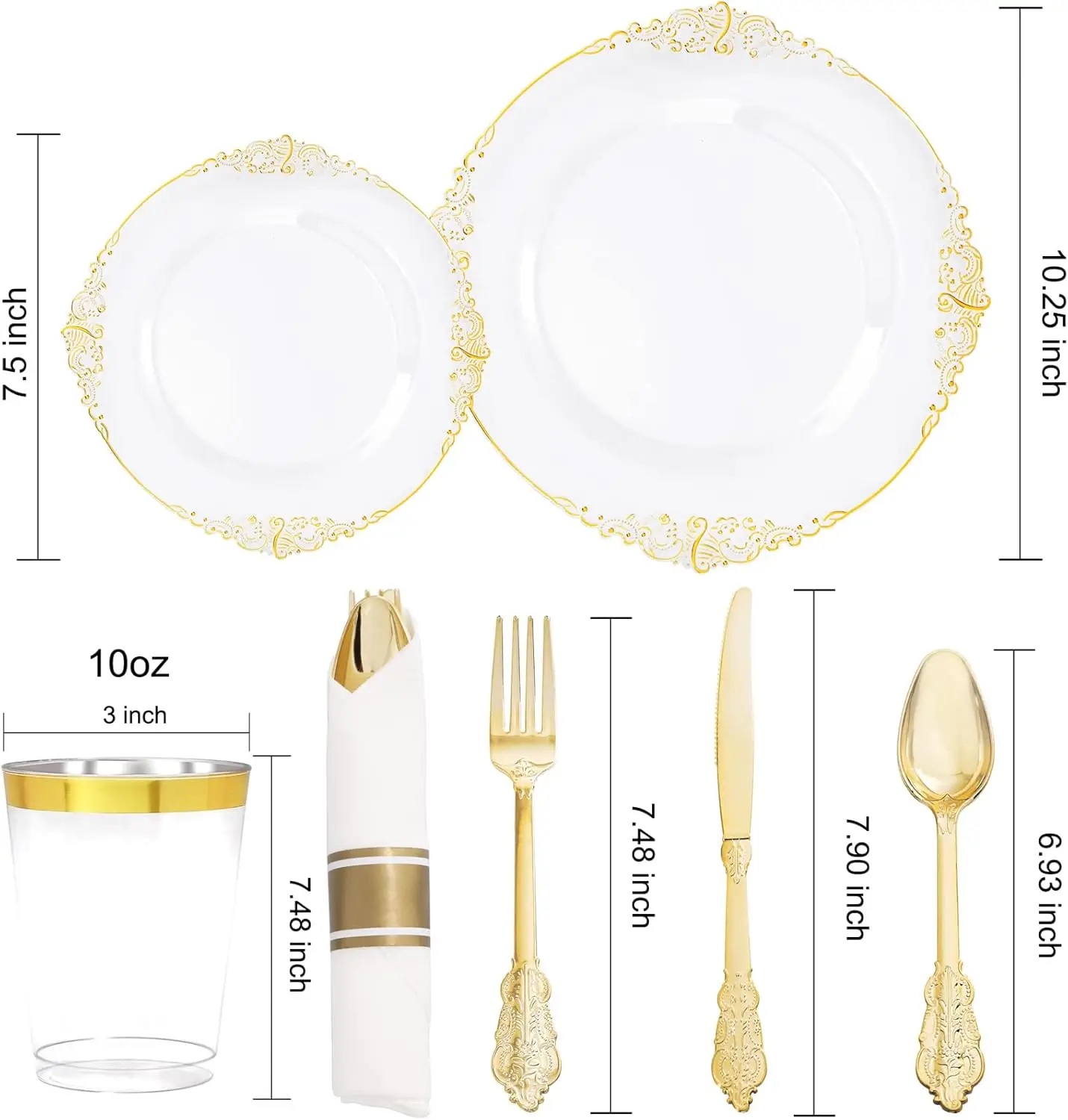 - Packaging Components - The tableware of clear gold plastic plates is extremely suitable for 50 guests, which is consist of 50 dinner plates, 50 dessert plates, 50 knives, 50 forks, 50 spoons, 50 cups, 50 rolled napkins. Choosing gold wedding plates will give you a wonderful experience!