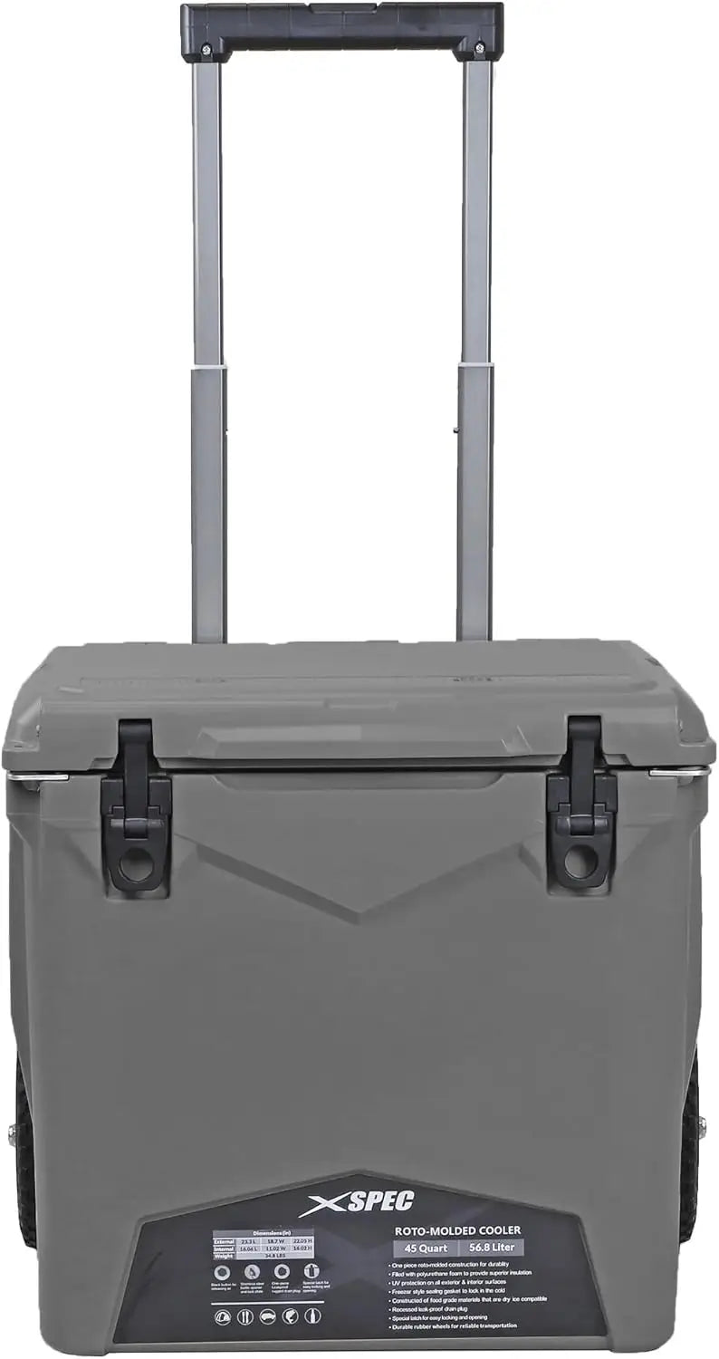 Conquer your outdoor adventures with this pro-tough 45-quart roto molded ice chest. Featuring durable wheels for easy towing and professional-grade construction, this heavy-duty cooler keeps your food and drinks ice-cold for camping, fishing, and outdoor activities.