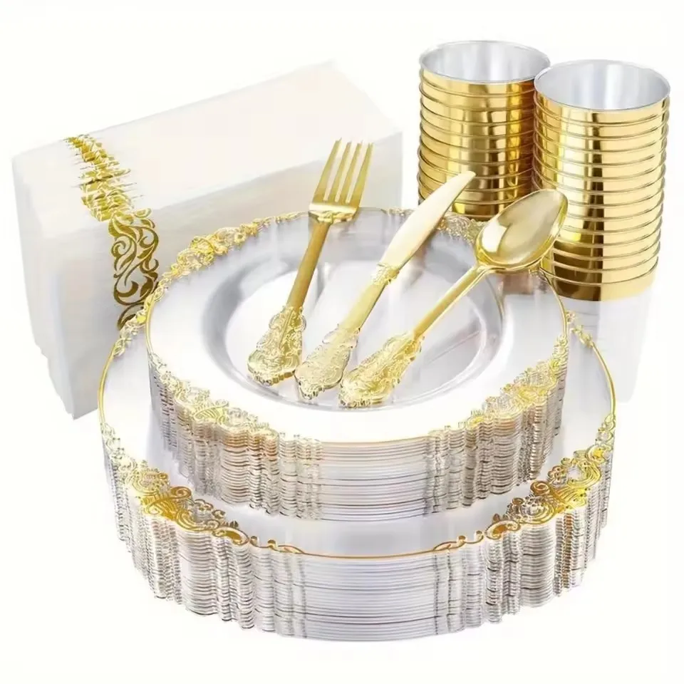 Safety and health: The material is 100% food grade plastic and does not contain BPA. Our golden plastic board will not have any impact on your health. Please rest assured. Special design: These transparent and golden plates have the same shape as the flowers, making these plastic plates feel like beautiful flowers to decorate your table. Convenient life: these gold plates and disposable silverware can be thrown away when they are used up. There is no problem with cleaning the table, and you will have more leisure time. Applicable occasions: These golden disposable plates and plastic tableware are suitable for all kinds of gatherings. The elegant appearance brings a more refined feeling to the dining table and enhances everyone's dining experience. Customer Service: We put customer experience first. If you have any problems with these transparent and golden plastic plates, you can contact us. We will try our best to help you and hope you have a pleasant shopping experience.