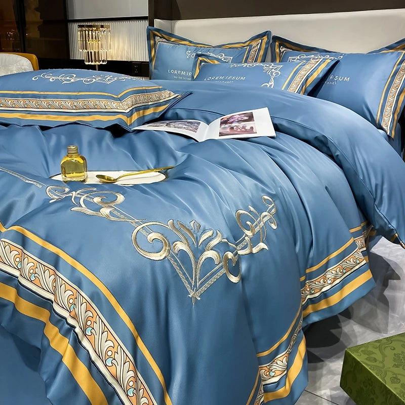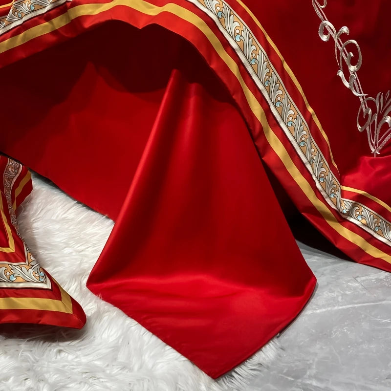 European Style Gold Edge Embroidered Bedding Set Luxury White Satin Cotton Duvet Cover Bed Sheets Pillowcases King Queen Size