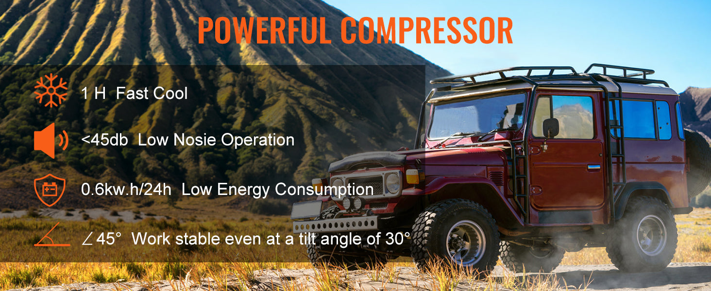 Rapid Cooling: Experience quick and efficient cooling with our mini car fridge. Equipped with an upgraded compressor, it can cool from 77°F to -4°F in just 1 hour, ensuring your beverages and food stay refreshingly chilled. It even performs flawlessly at a 45° inclination, making it the perfect companion for outdoor adventures or work on the go.
